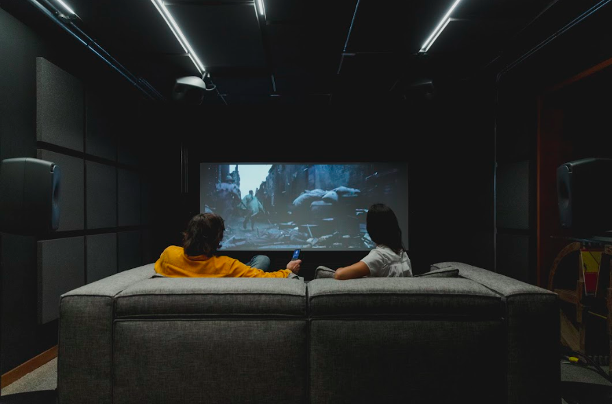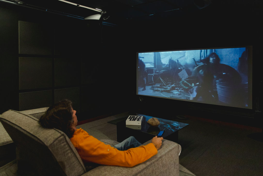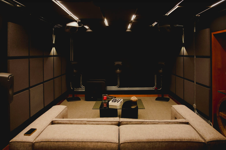Tenemos dos principales ambientes: “The Black Room” es la sala de Cine, que siempre tendrá perfectamente calibrado el mejor sistema de Audio envolvente que podrán encontrar en Lima, el último proyector y de alta definición para cine dedicado lanzado a nivel mundial y una súper pantalla que le haga justicia. Por ejemplo actualmente tenemos una pantalla que cambia de formato automáticamente según la fuente de video que reciba. Es decir, para ver una serie la pantalla se torna más cuadrada como una TV mientras que para ver una película el formato cambia al de una pantalla de cine 16-9.
