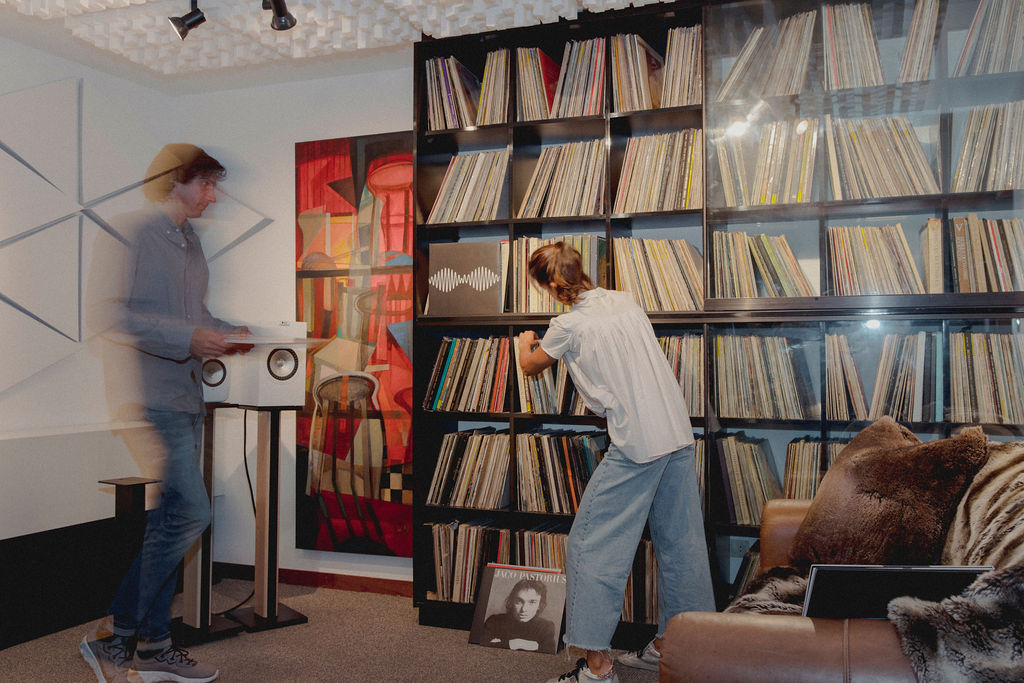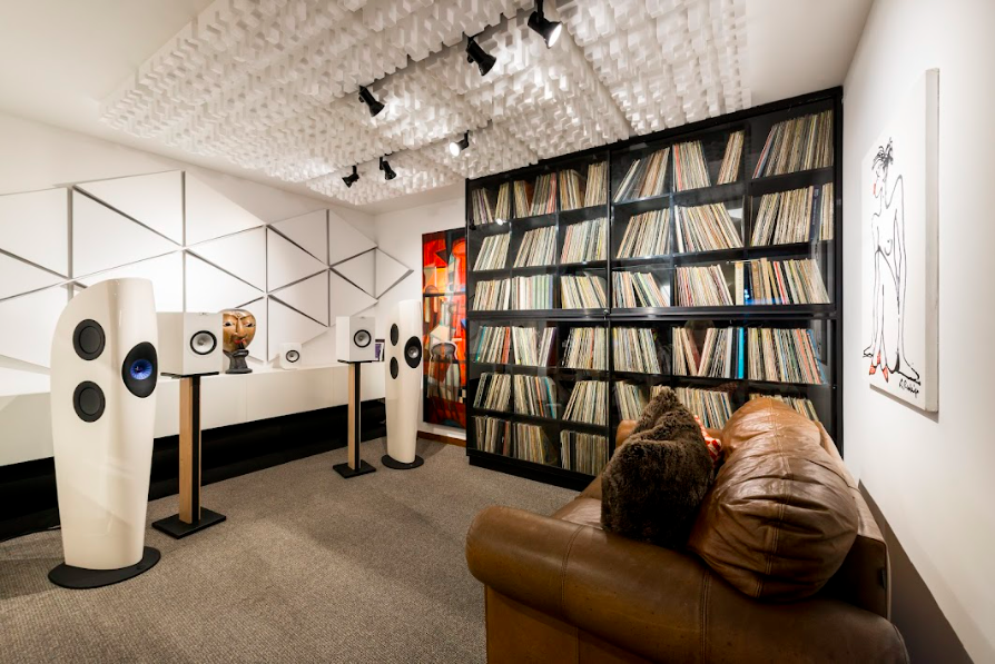 La otra sala principal la llamamos “The White Room” que es la sala de escucha preparada para sorprender hasta el audiófilo más exquisito. Para empezar cuenta con una colección de más de 5000 discos de vinilo que ponemos a disposición del cliente. Pueden elegir la fuente que quieran, desde un tornamesa hasta su app de Spotify en el móvil. Respecto a los parlantes, los cambiamos constantemente, Clifford debe escuchar y probar cada marca y modelo que recibimos para poder hacer una recomendacion. Con ello vamos variando la panelería acústica.