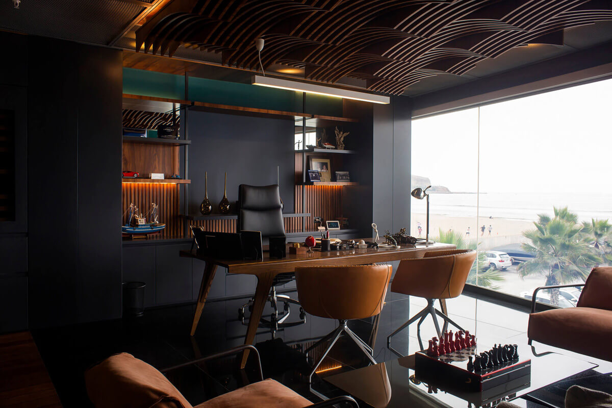 This spectacular smart office facing the marina was designed by architects Deborah Kouri and Maria Elisa Zegarra of L'Architettura interior design studio. It features a 180-degree motorized TV rack, an audio system with hidden speakers to power the TV or listen to music, and full control of audio, video, and lighting from your smartphone or remote.