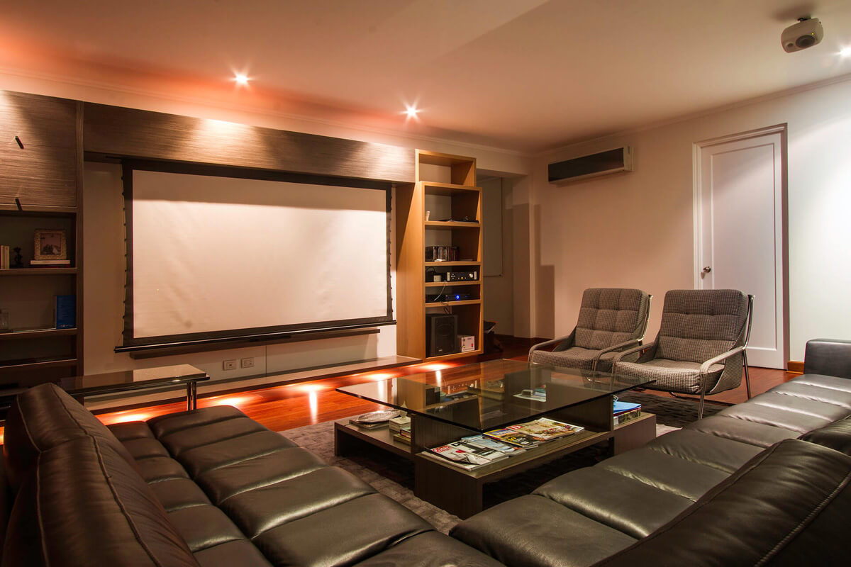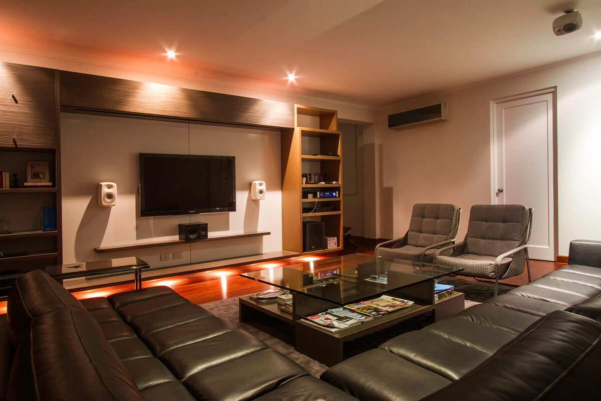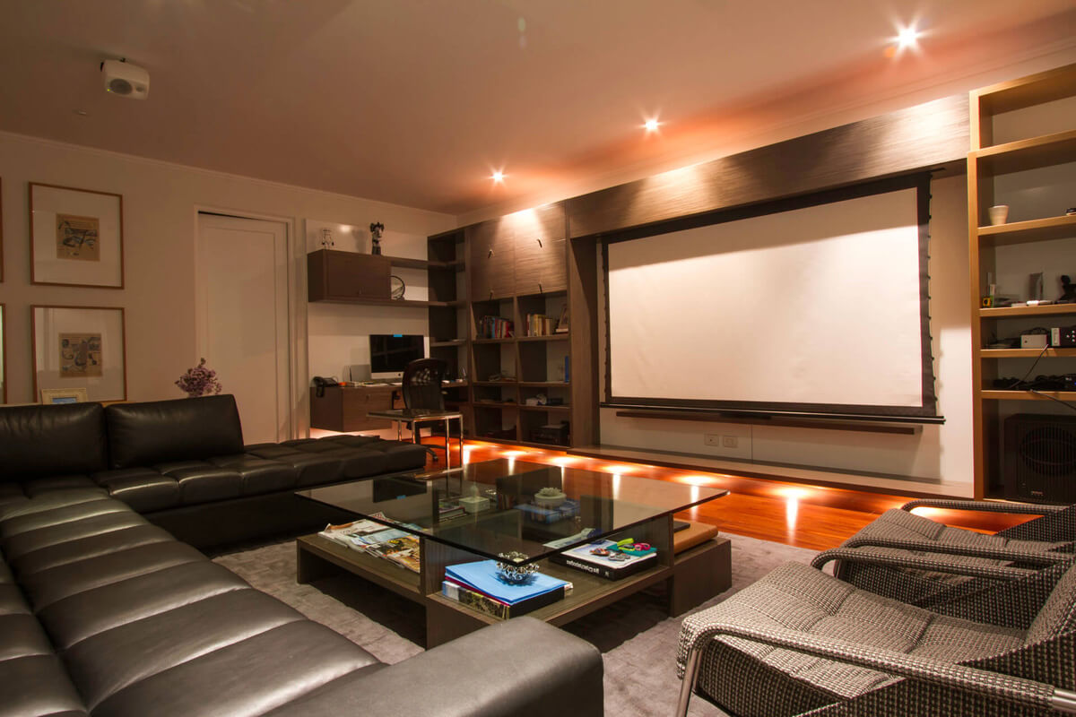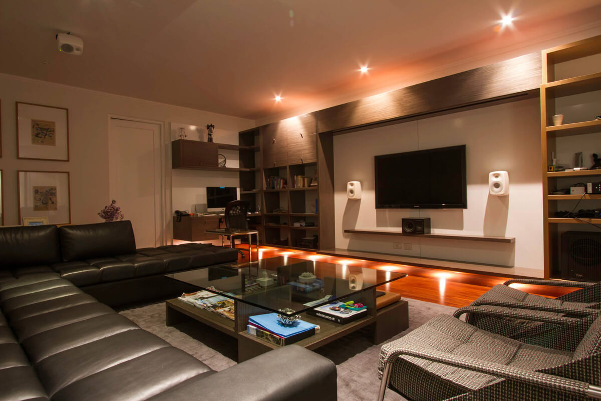 Architects Carolina Graña and Mirella Kahan designed this masculine-style living room for a discerning client who loves video games and movies. The task was to integrate the top-quality equipment seamlessly with the interior design to ensure optimal performance and elevate the viewing experience, be it on TV or on the big screen, as preferred by the client.