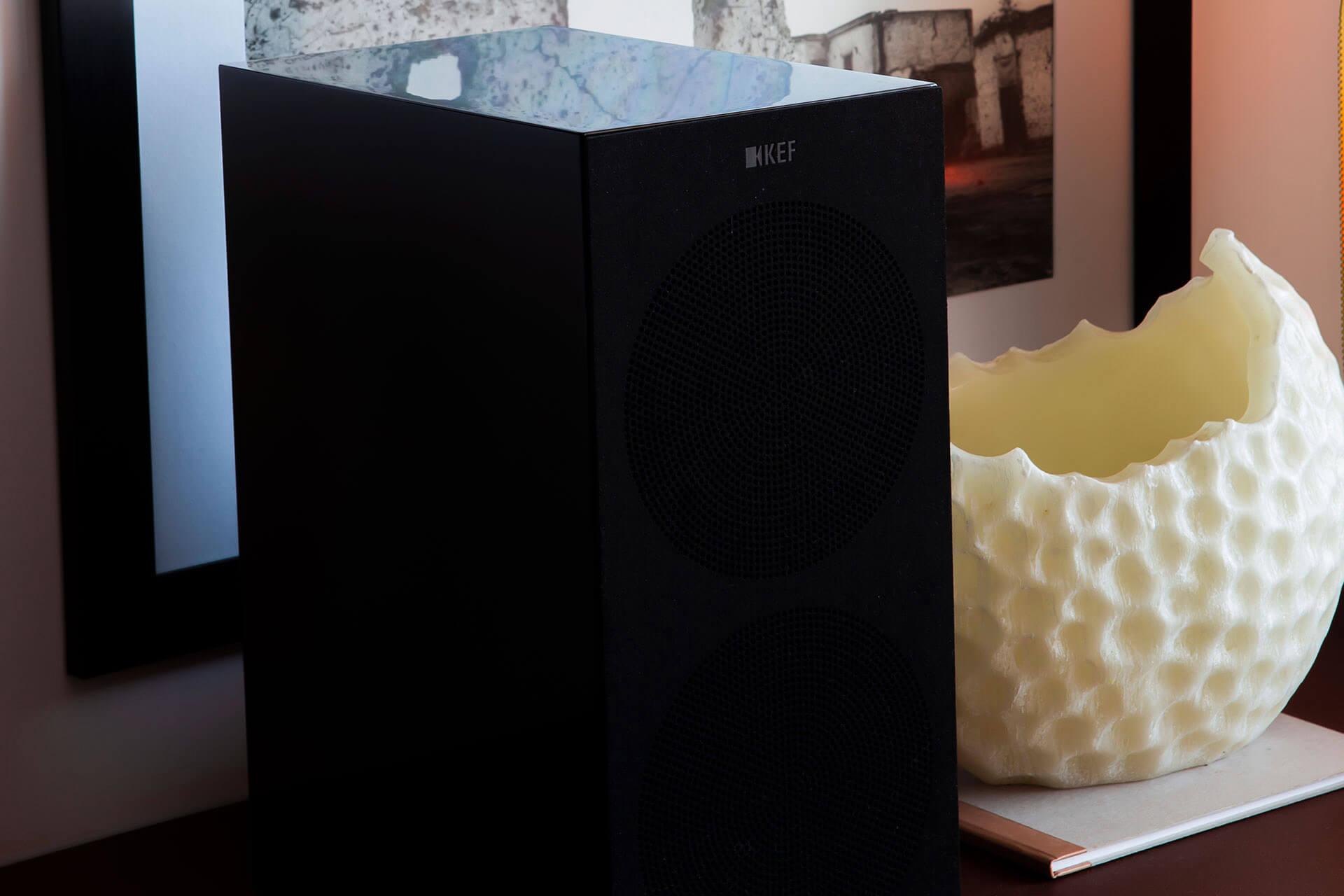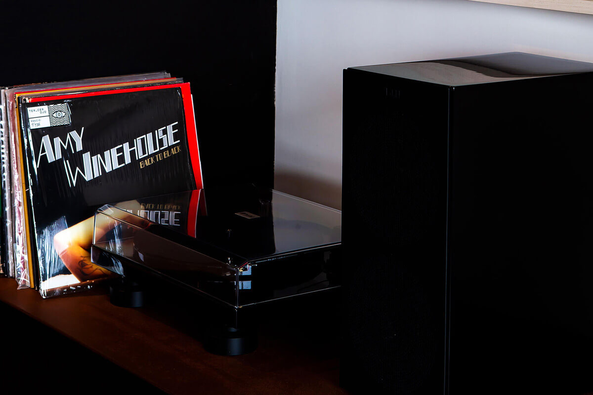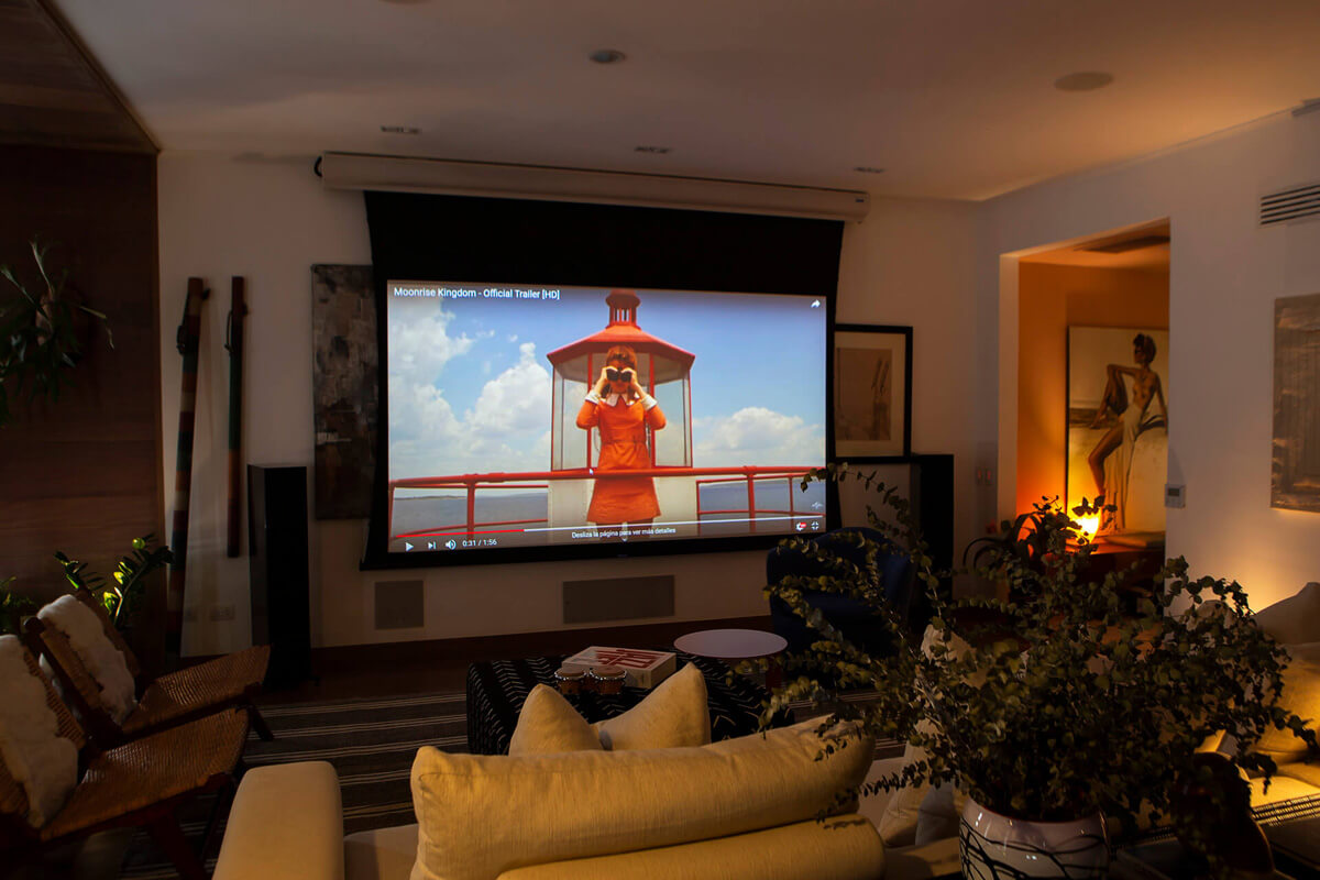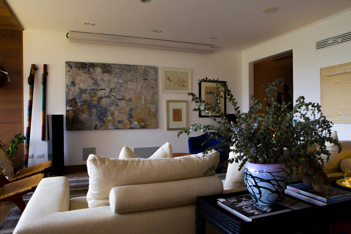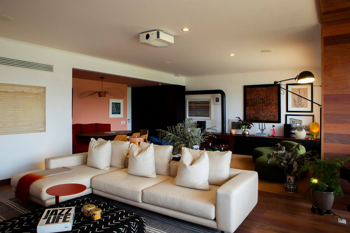 This cozy apartment was designed by decorators Daniela Ghezzi and Stephanie Michell for a hi-fi audio and video enthusiast client. They aimed to blend built-in speakers for a high-quality movie theater with tower speakers at one end and cabinet speakers at the other to deliver surround sound throughout the room. The client has the option of streaming audio or playing their vinyl records on a turntable.