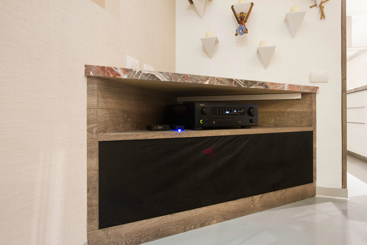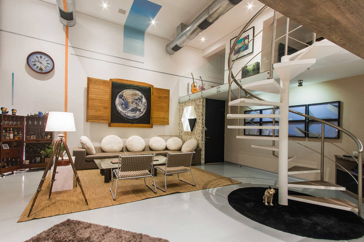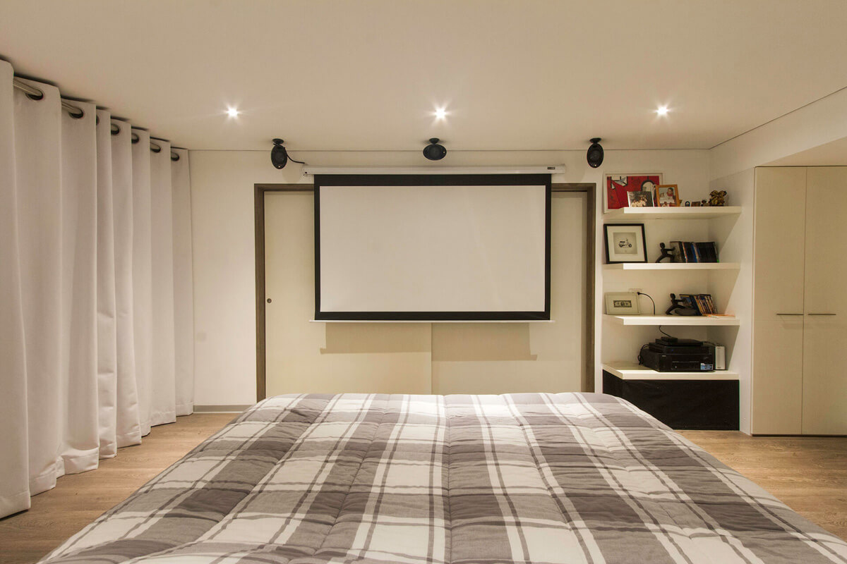 This modern loft was designed by architect and photographer Sergio Fernandez. The client sought powerful audio without sacrificing quality. Despite the challenge posed by the 7-meter-high ceilings, Fernandez was able to deliver a delightful sound experience. A home theater was constructed in the main room with a projector and a motorized screen.