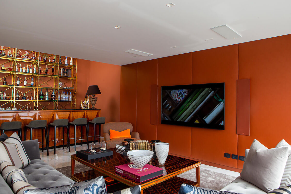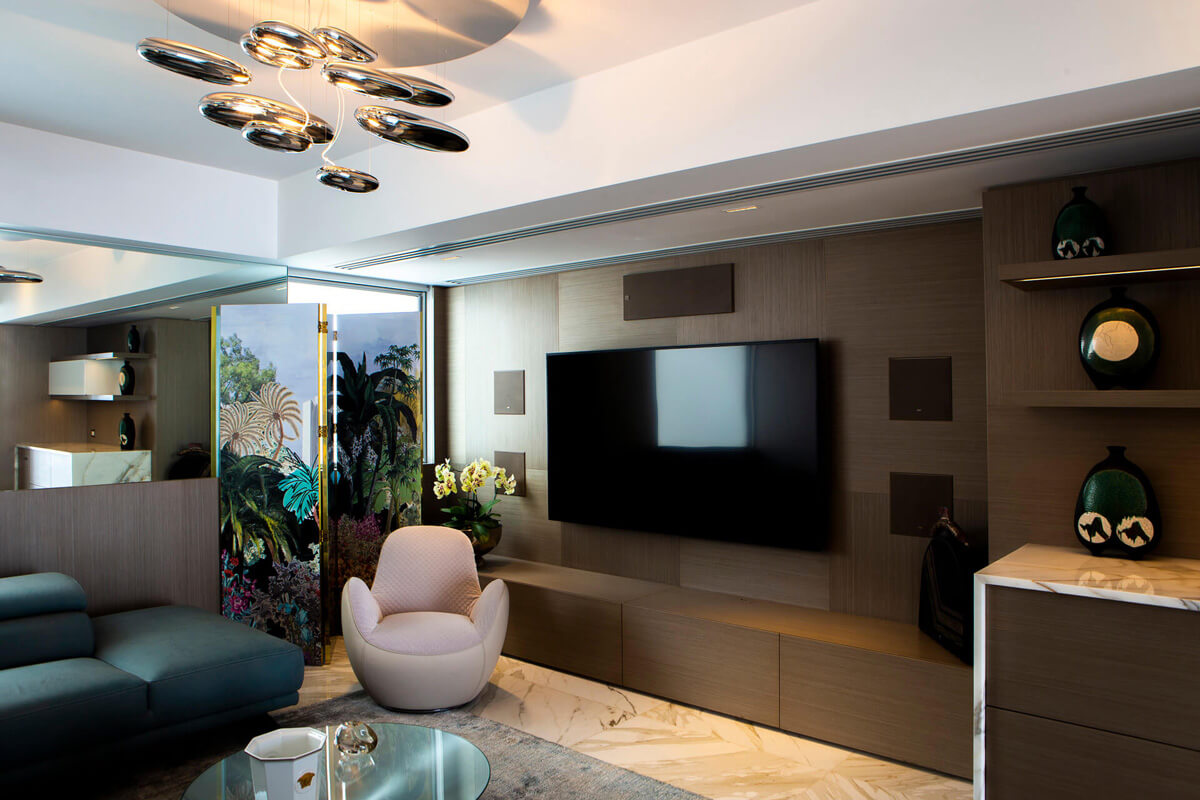 equipos de audio en la sala principal, comedor, sala-bar, sala de estar y balcones. A través de